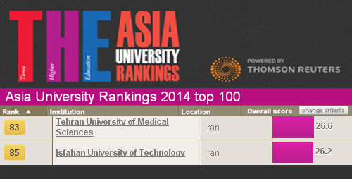 دکتر جعفر مهراد با اشاره به بهره گیری این مؤسسه از شاخص های به کار گرفته شده در رتبه بندی سال گذشته در رتبه بندی 2014-2013 افزود: در دومین رتبه بندی آسیایی این مؤسسه که در 18 ژوئن 2014 (28 خرداد 1393) منتشر شد حضور دانشگاه های صنعتی شریف، علوم پزشکی تهران و صنعتی اصفهان قابل توجه است.