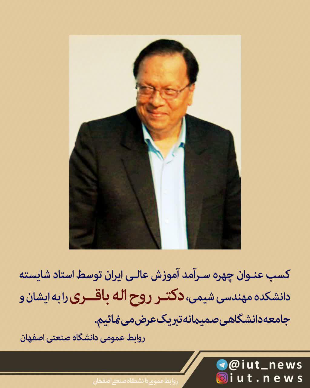 در این مراسم که 18 اردیبهشت ماه و با حضور دکتر مجتبی شریعتی نیاسر معاون آموزشی وزیر علوم به میزبانی دانشگاه شهید بهشتی برگزار شد، 11 شخصیت برجسته و سرآمد آموزش عالی ایران از جمله دکتر روح اله باقری استاد دانشکده مهندسی شیمی دانشگاه صنعتی اصفهان مورد تجلیل قرار گرفتند.