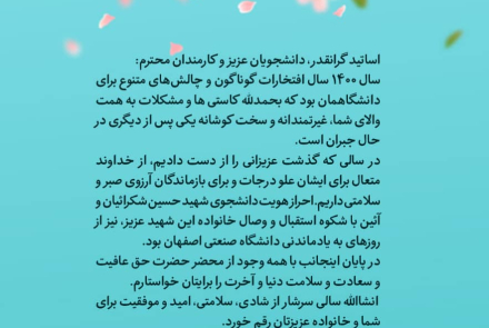 فرصت را مغتنم شمرده، حلول سال نو و آغاز قرن جدید را که مقارن با ماه عیدها، شعبان المعظم گشته تبریکات خود را به خانواده بزرگ دانشگاه صنعتی اصفهان تقدیم نمایم.