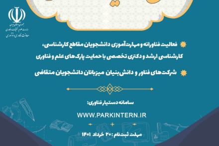 شایانذکر است: دانشجويان تمامي مقاطع تحصيلي میتوانند تا تاريخ 20 خردادماه، برای دريافت اطلاعات بیشتر و مطالعه آیین نامه طرح به سامانه دستیار فناوری به نشاني: (http://www.parkintern.ir) مراجعه كنند و یا با شمارهتلفن 33911940 (سرکار خانم صفی خانی) تماس بگيرند.
