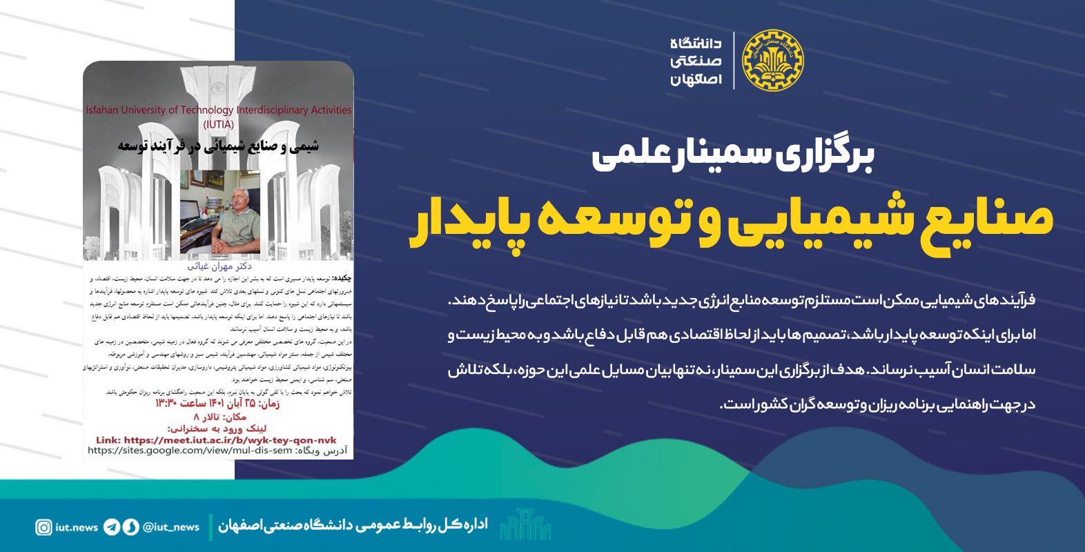 گفتني است اين سمينار علمي روز چهارشنبه، 25 مهرماه ساعت ۱۳.۳۰ در تالار ۸ دانشگاه صنعتی اصفهان برگزار می گردد. همچنین این سخنرانی از طريق سامانه مجازي به نشاني : https://meet.iut.ac.ir/b/wyk-tey-qon-nvk به صورت رايگان برگزار می‌شود.