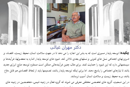 دكتر مهران غياثي استاد بازنشسته دانشكده شيمي، با بيان اينكه توسعه پایدار مسیری است که به بشر این اجازه را می دهد تا در جهت سلامت انسان، محیط زیست، اقتصاد و ضرورت­های اجتماعی نسل های کنونی و نسل­های بعدی تلاش کند بيان داشت: شیوه های توسعه پایدار اشاره به محصول ها، فرآیندها و سیستم هائی دارد که این شیوه را حمایت کنند.