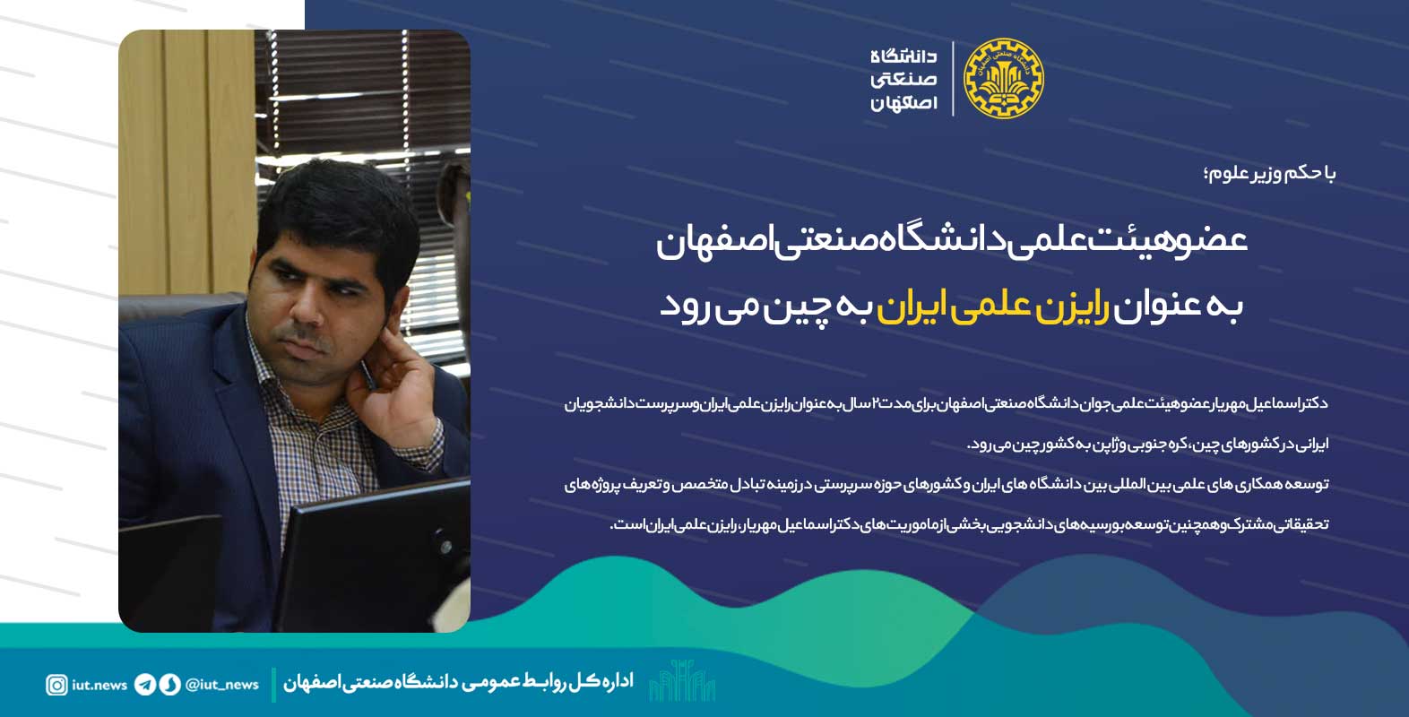 دکتر اسماعیل مهریار عضو هیئت علمی جوان دانشگاه صنعتی اصفهان با حکم وزیر علوم تحقیقات و فناوری، برای مدت ۲ سال به عنوان رایزن علمی ایران به کشور چین می رود.