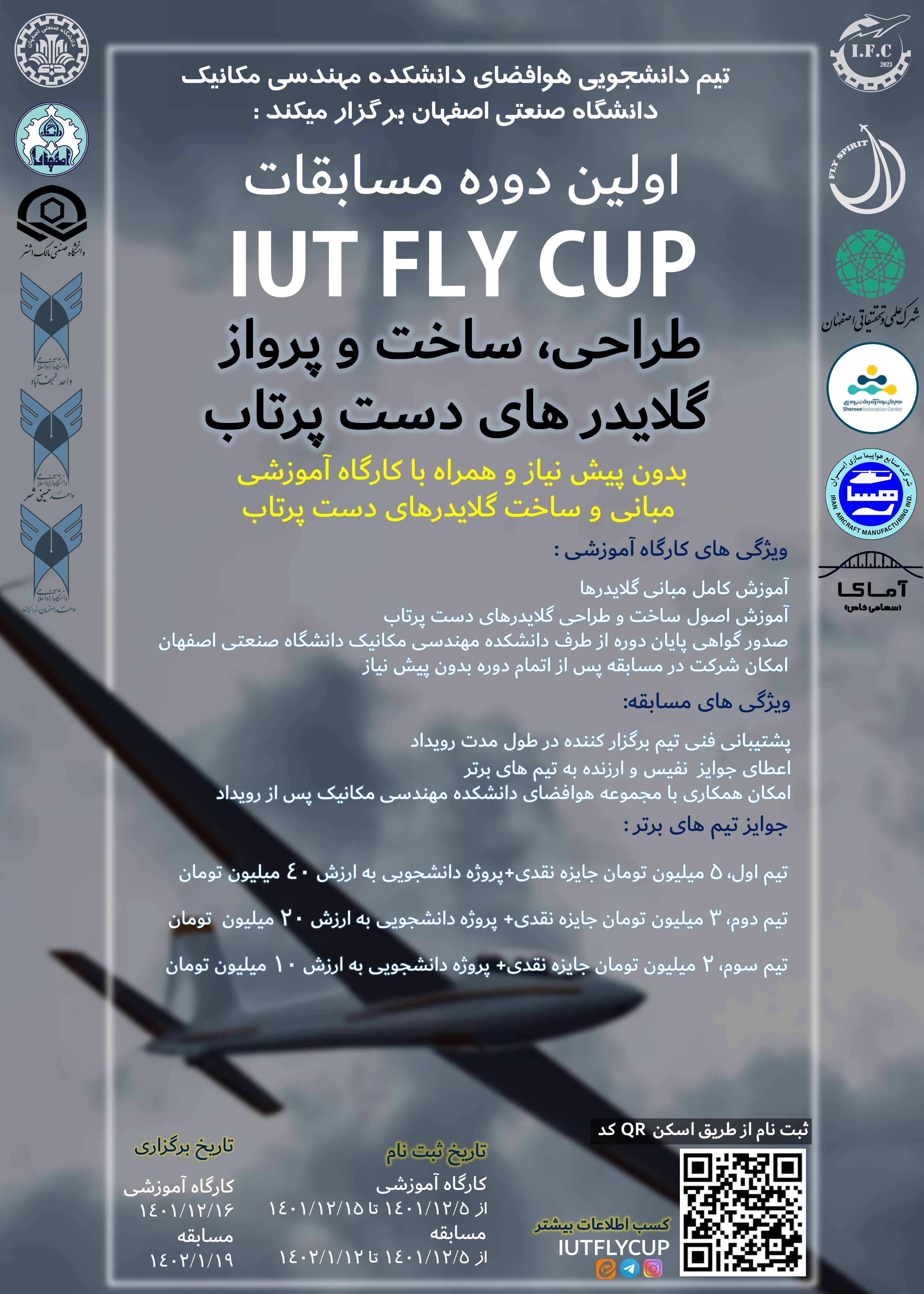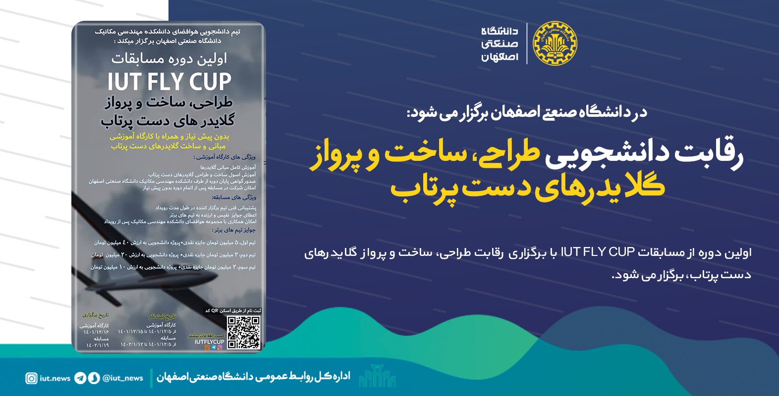 به همت تیم دانشجویی هوافضای دانشکده مهندسی مکانیک دانشگاه صنعتی اصفهان، اولین دوره از مسابقات IUT FLY CUP با برگزاری رقابت طراحی، ساخت و پرواز گلایدرهای دست پرتاب، برگزار می شود.