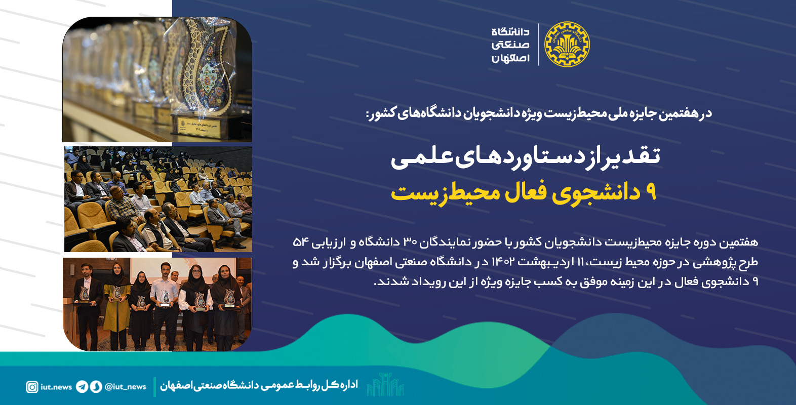 هفتمین دوره جایزه محیطزیست دانشجویان کشور با حضور نمایندگان 30 دانشگاه و ارزیابی 54 طرح پژوهشی در حوزه محیط زیست، 11 اردیبهشت 1402 به میزبانی دانشکده مهندسی منابع طبیعی دانشگاه صنعتی اصفهان برگزار شد و 9 دانشجوی فعال در این زمینه موفق به دریافت جایزه ویژه از این رویداد شدند.
