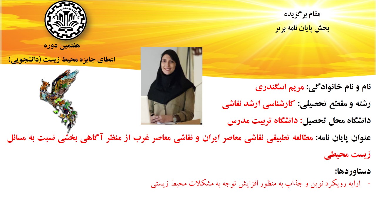مقام برگزیده بخش پایان نامه برتر، به دانشجوی رشته کارشناسی ارشد نقاشی دانشگاه تربیت مدرس اهدا شد که توانسته است با ارایه پایان نامه مطالعه تطبیقی نقاشی معاصر ایران و نقاشی معاصر غرب از منظر آگاهی بخشی نسبت به مسائل زیست محيط ؛ رویکردی نوین و جذاب به منظور افزایش توجه به مشکلات محیط زیستی در حوزه هنر داشته باشد.