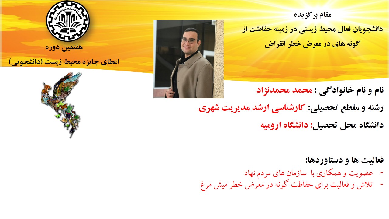 همچنن از تلاش محمد محمدنژاد، دانشجوی کارشناسی ارشد مدیریت شهری از دانشگاه ارومیه برای حفاظت از گونه های در معرض خطر انقراض مانند میشمرغ، پرندهای که در فهرست سرخ اتحادیه بینالمللی حفاظت از طبیعت قرار دارد ، در بخش دانشجویان فعال محیط زیستی در زمینه حفاظت از گونه های در معرض خطر انقراض ، تقدیر به عمل آمد.