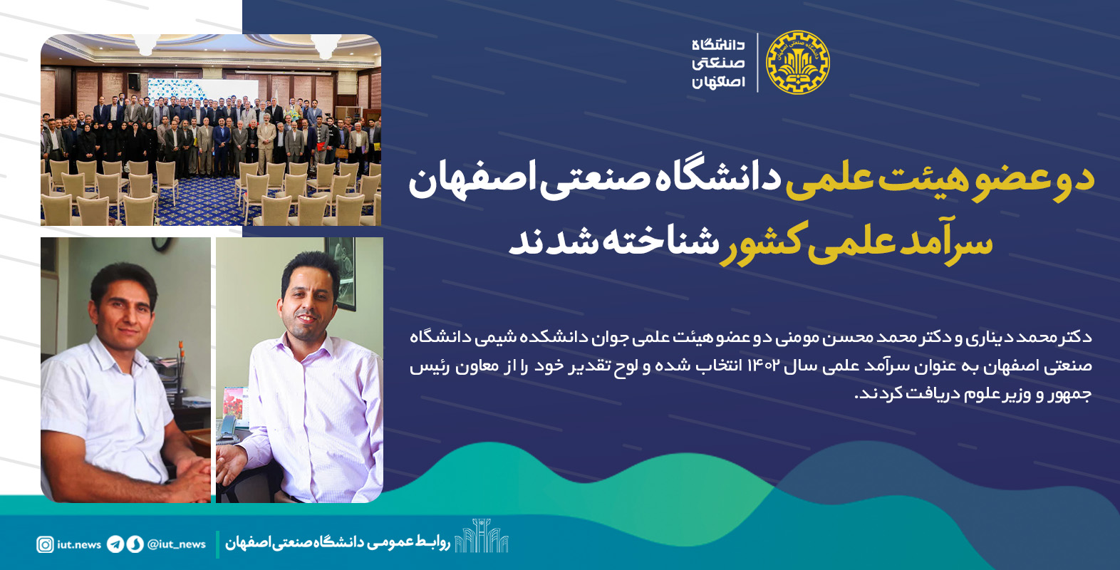 دکتر محمد دیناری و دکتر محمد محسن مؤمنی دو عضو هیئت‌علمی جوان دانشکده شیمی دانشگاه صنعتی اصفهان به‌عنوان سرآمد علمی سال ۱۴۰۲ انتخاب شده و لوح تقدیر خود را از معاون رئیس‌جمهور و وزیر علوم دریافت کردند.