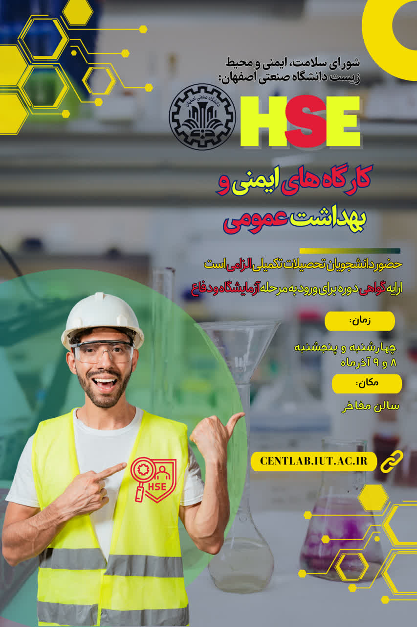 اخذ گواهی شرکت در کارگاههای آموزشی ایمنی، بهداشت و محیطزیست جهت تصویب پروپوزال و دریافت مجوز حضور در آزمایشگاه / کارگاه پژوهشی برای دانشجویان تحصیلات تکمیلی الزامی است.