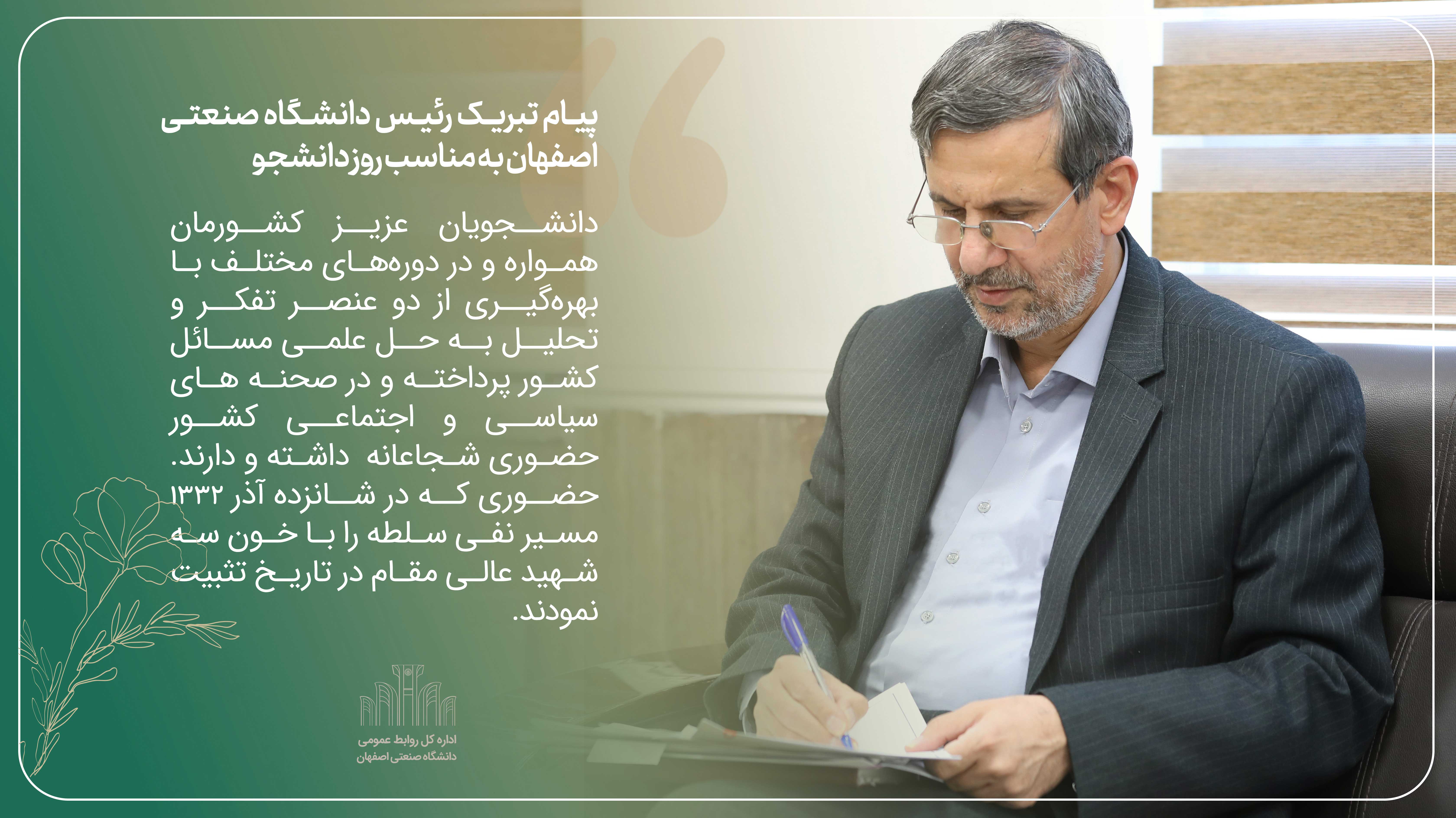 اینجانب ضمن تبریک روز دانشجو به جامعه دانشگاهی بالاخص دانشجویان عزیز دانشگاه صنعتی اصفهان، آنها را به استفاده حداکثری از زمان برای نشستن پای درس محبت استاد ترغیب نموده، خواستار شناخت هرچه بیشتر استعداد درونی خویش و کاربست دانش برای دستیابی به جایگاه واقعی دانشجو هستم. بیایید کلاس درس را ارج نهیم و مسیر موفقیت همه بزرگان را با منش استادشاگردی با گامهای بلند بپیماییم.