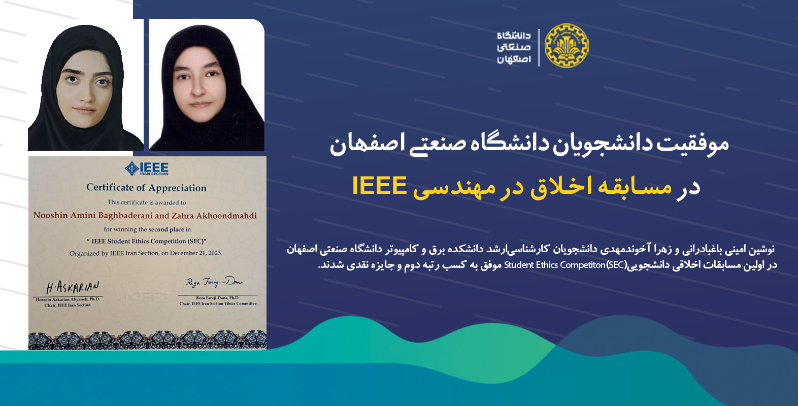 نوشین امینی باغبادرانی و زهرا آخوندمهدی دانشجویان کارشناسی‌ارشد دانشکده برق و کامپیوتر دانشگاه صنعتی اصفهان در اولین مسابقات اخلاقی دانشجوییStudent Ethics Competiton(SEC) موفق به کسب رتبه دوم و جایزه نقدی شدند.