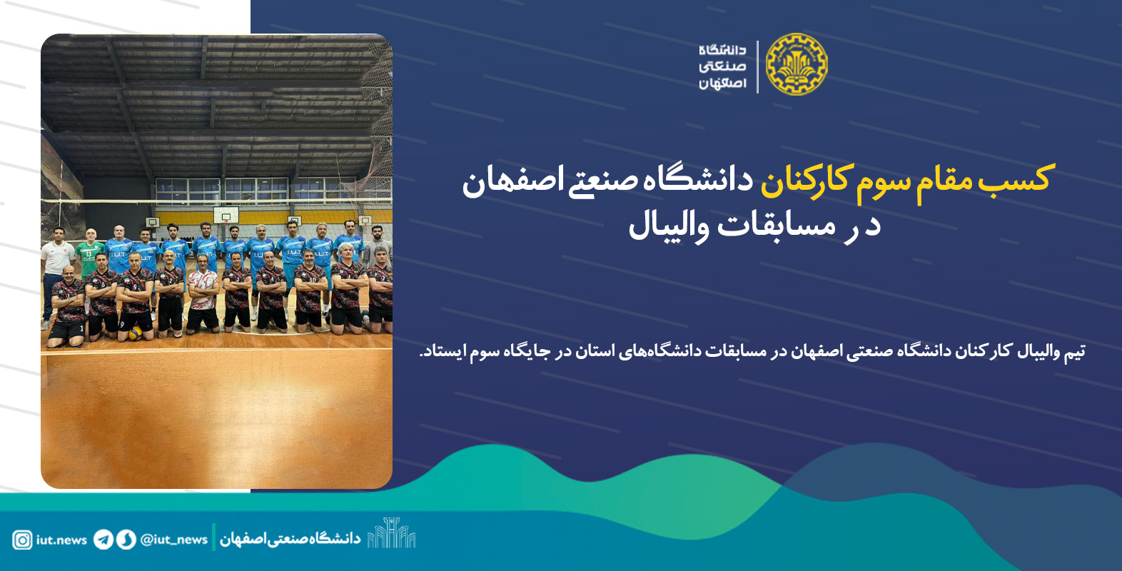 به گزارش روابط عمومی دانشگاه صنعتی اصفهان، تیم والیبال کارکنان این دانشگاه با بازی مهدی سلمانی، فرشاد منصوری، ایمان حسنزاده، محمدرضا ودادی، علی اشرفی، امیرحسین علیشیخی، مسعود تقیان، سیدعلی باطنی، حسن مشایخ و داود حسینی مقام سوم مسابقات کارکنان دانشگاههای استان را کسب کرد.