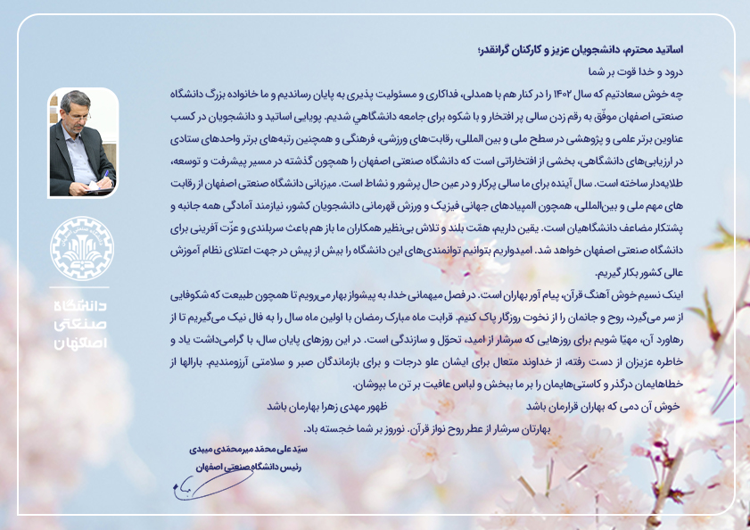 چه خوش سعادتیم که سال 1402 را در کنار هم با همدلی، فداکاری و مسئولیت پذیری به پایان رساندیم و ما خانواده بزرگ دانشگاه صنعتی اصفهان موفّق به رقم زدن سالی پر افتخار و با شکوه برای جامعه دانشگاهي شديم.