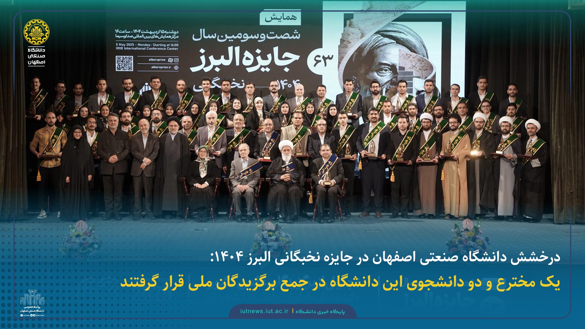 در مراسم شصتوسومین دوره جایزه البرز که اردیبهشت ۱۴۰۴ در مرکز همایشهای بینالمللی صداوسیما برگزار شد، سه نماینده از دانشگاه صنعتی اصفهان موفق به کسب این جایزه علمی معتبر شدند.